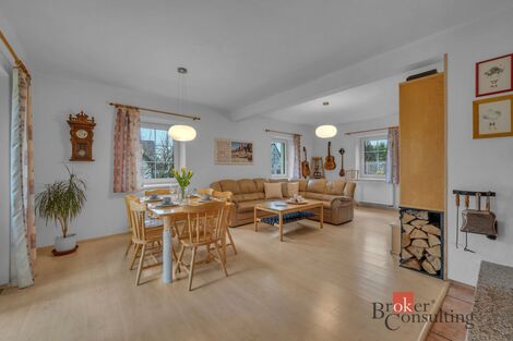 Exkluzivně Vám nabízíme k prodeji zděný rodinný dům o celkové užitné ploše 138 m2 + půdní prostor o výměře 29 m2 s pozemkem 1216 m2 v klidné liberecké části Krásná Studánka. Součástí dvoupodlažního rodinného domu je velká a mírně svažitá zahrada, samostatná dvougaráž s dílnou, technická místnost se zahradním nářadím, vlastní studna a dvoukomorová žumpa. Příjezd k domu je po zpevněné komunikaci, kde je možnost dalšího venkovního stání pro jedno auto. Brána a vrata do garáže jsou opatřena elektrickými pohony. Dispozičně je dům řešen jako 5+kk + obyvatelný půdní prostor. Je ideální pro rodinu s dětmi a obrovskou výhodou jsou jeho nízké provozní náklady. Nemovitost nabízí dostatečný klid s dobrou dopravní dostupností a v blízkosti přírody. V celém objektu je vytápění formou tepelného čerpadla LG 14kW (metoda vzduch, voda) Zároveň je možnost vytápění krbem s teplovodní vložkou a rozvodem do radiátorů. V 12/2021 proběhla výměna všech oken za trojskla VEKRA. V přízemí domu naleznete prostorný a světlý obývací pokoj s výstupem na venkovní terasu, která Vám poskytne krásný výhled do zahrady. Součástí přízemí je moderní kuchyňský kout a jídelna. Kuchyňská linka je vybavena dvěma troubami a plynovým sporákem na PB, s keramickou deskou a myčkou. Dále zde najdete ložnici s vestavěnou skříní a koupelnu s vanou a samostatným WC. V patře domu se nacházejí dva dětské pokoje, pracovna a koupelna se sprchovým koutem a WC. Z jednoho dětského pokoje je vstup do útulného obytného podkroví. Dům je ze 2/3 podsklepený, injektovaný a vhodný pro další využití úložných prostorů. S financováním Vám rádi pomůžeme a zařídíme kompletní servis. Těšíme se na Vás na prohlídkách.